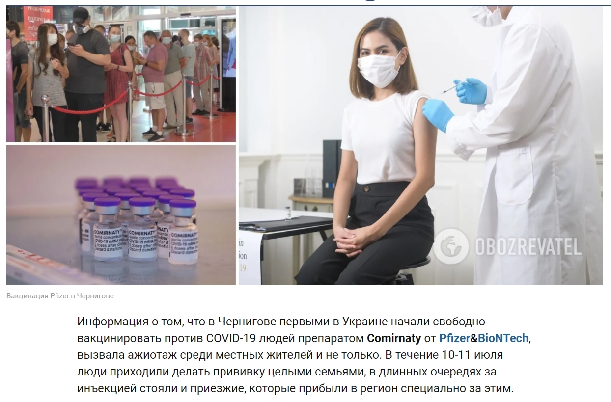 Пряма мова: "Ось і пройшов перший день вакцинації вакциною Pfizer, сьогодні Чернігів став першим містом в Україні, в якому проводили щеплення вакциною Pfizer в пунктах масової вакцинації.