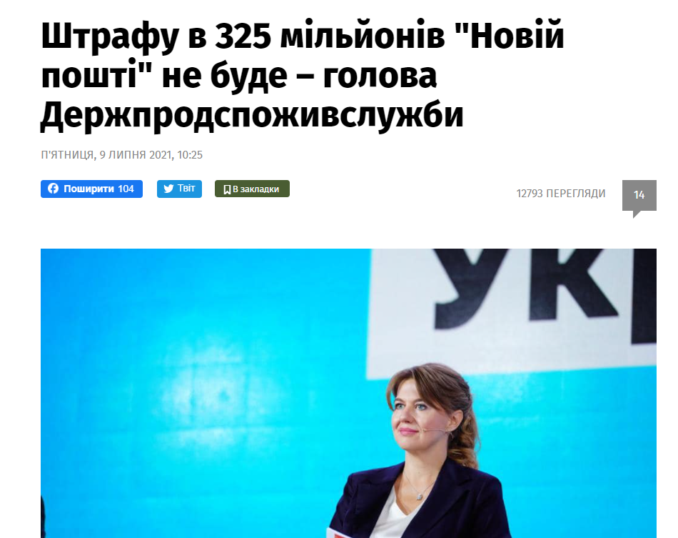 Голова Державної продовольчої споживчої служби Владислава Магалецька запевняє, що накладений на "Нову пошту" штраф у понад 325 мільйонів гривень буде скасований.