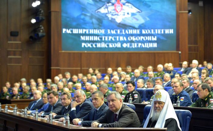 На коллегии МО патриарх сидит в первом ряду: четырехзвездные генералы армии у него за спиной.