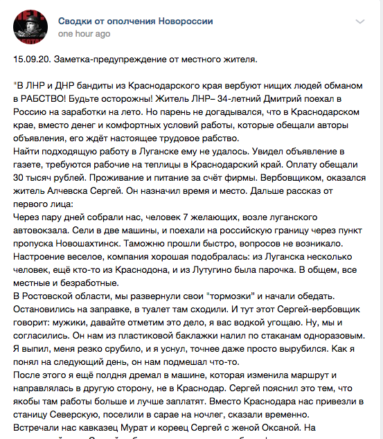 "В ЛНР и ДНР бандиты из Краснодарского края вербуют нищих людей обманом в РАБСТВО! Будьте осторожны! Житель ЛНР– 34-летний Дмитрий поехал в Россию на заработки на лето. Но парень не догадывался, что в Краснодарском крае, вместо денег и комфортных условий работы, которые обещали авторы объявления, его ждёт настоящее трудовое рабство.