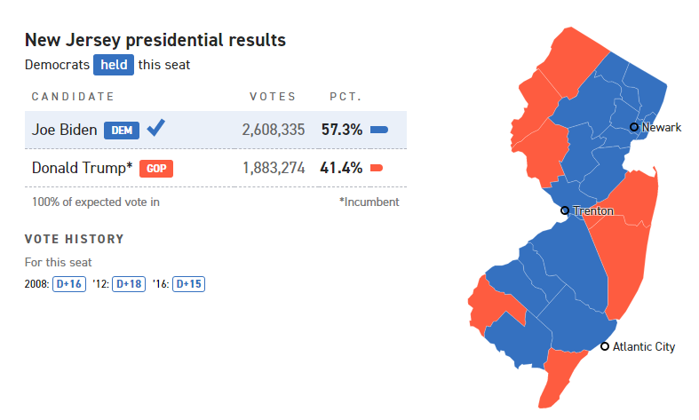 “The state is considered a Democratic stronghold, since it has consistently voted for Democrats in presidential elections since 1992. Democrats have also controlled both chambers of the state legislature since 2002. New Jersey currently has two Democratic United States senators. New Jersey's Class I Senate seat has been Democratic since 1959 (with an 8-month exception in 1982). New Jersey's Class II Senate seat has been Democratic since 1979 (with a four-month exception in 2013). In addition, New Jersey's House congressional delegation has had a Democratic majority since 1964 with the exceptions of 1993–1997, 2006, and 2013–2017. As of July 1, 2020, there are more registered Democrats than unaffiliated voters for the first time in history.“