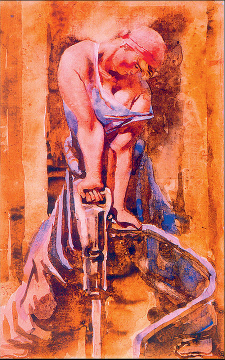 "The three figures were originally drawn on separate sheets of paper from women who posed for me in New York and London. Later, between 1975 and 1979, I took it into my head to make a composition. So I asked a few other women to assume the poses that would represent the bathers in fascist Europe. After the drawings were glued together, the images began to change many times. The central grotesque bather is the fascist. The bather at the left is the beautiful victim. The right hand bather is the ordinary European watching it all happen. A bomber appears in the upper left corner, which will cross the English Channel and bring an end to it all one day."