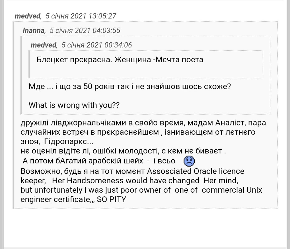 Розгорнути попередні цитати...Шушка, так він тутА сере регулярно)) А ти чого ти надриваєшся ?) Тобі яка різниця ?Тобто, Косташу - сере тутА регулярно, а один мій пост у цій гілці - це називається "шушка надривається"?![]()